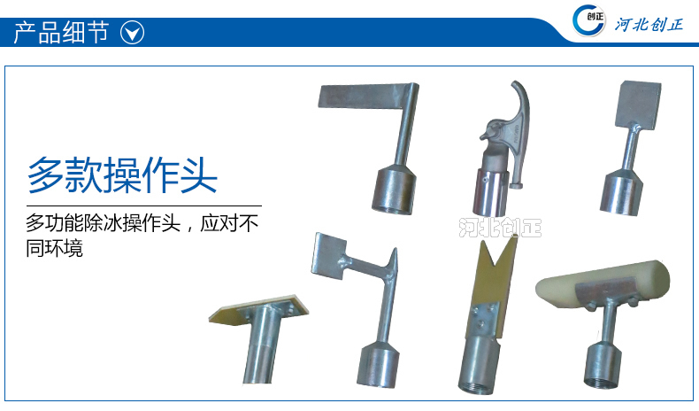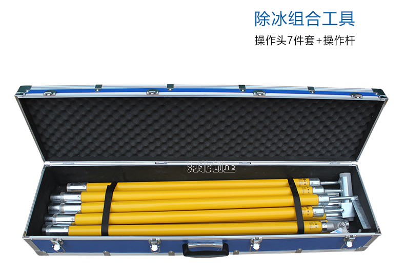 除冰組合工具由絕緣桿和不同的操作頭組成,通過(guò)敲、鏟、鉤等方式除去瓷瓶、支架、導(dǎo)線及桿塔上的積雪及覆冰。除冰作業(yè)時(shí),選取操作頭,安裝到絕緣桿的一端并擰緊后使用。絕緣桿分為長(zhǎng)、短規(guī)格,根據(jù)現(xiàn)場(chǎng)實(shí)際情況進(jìn)行組合。