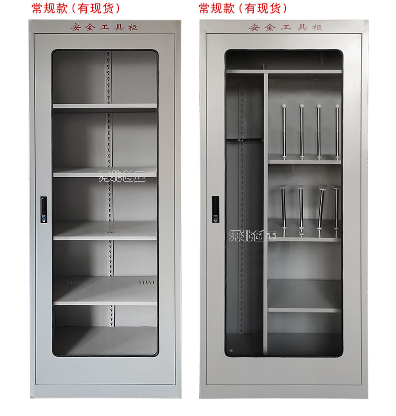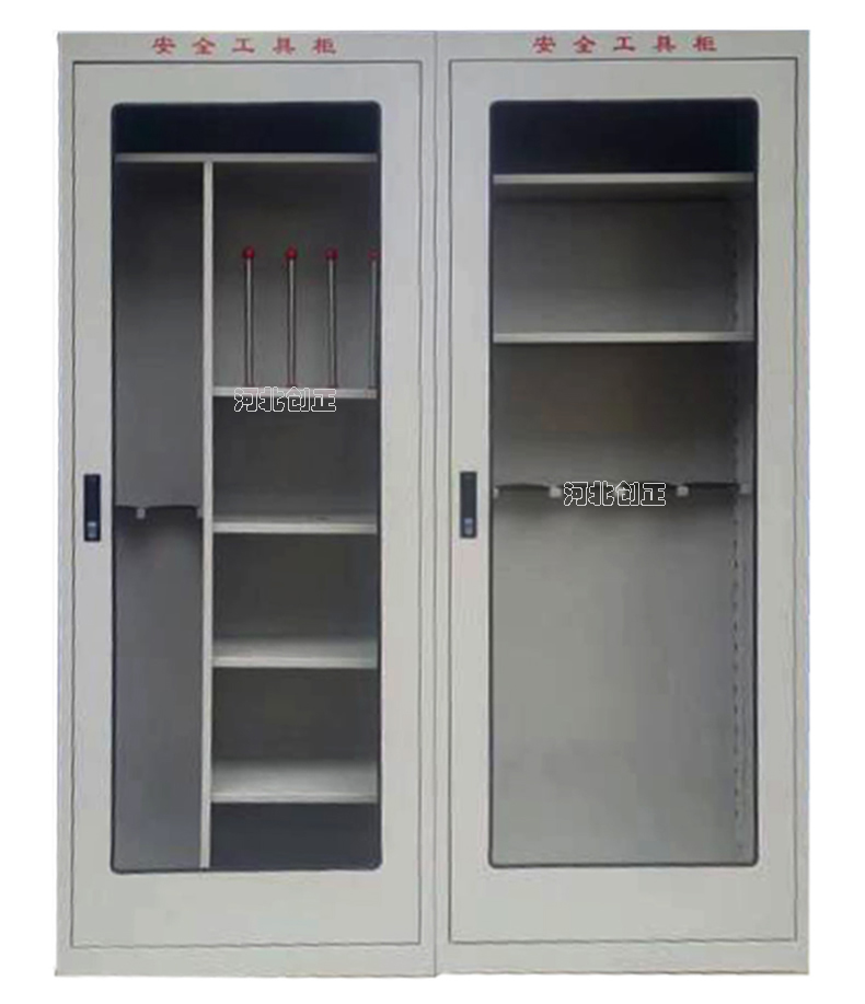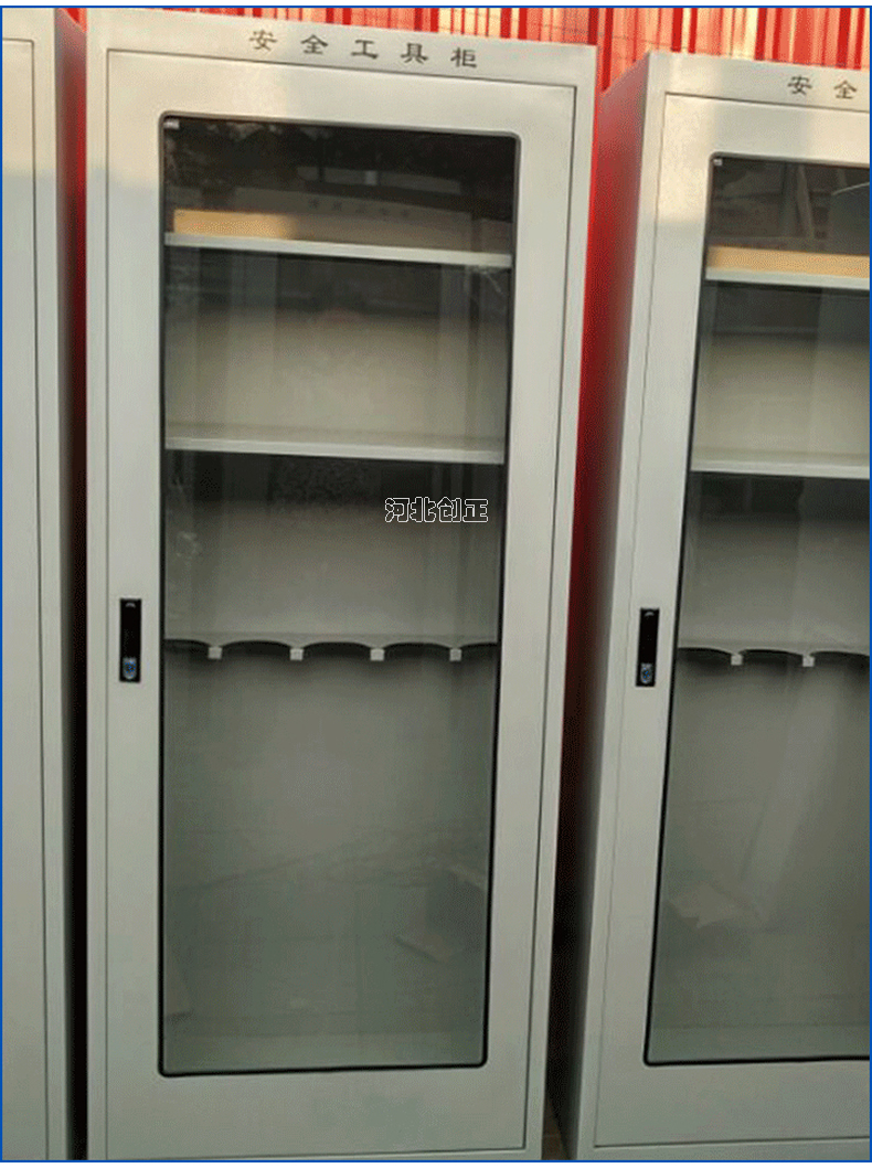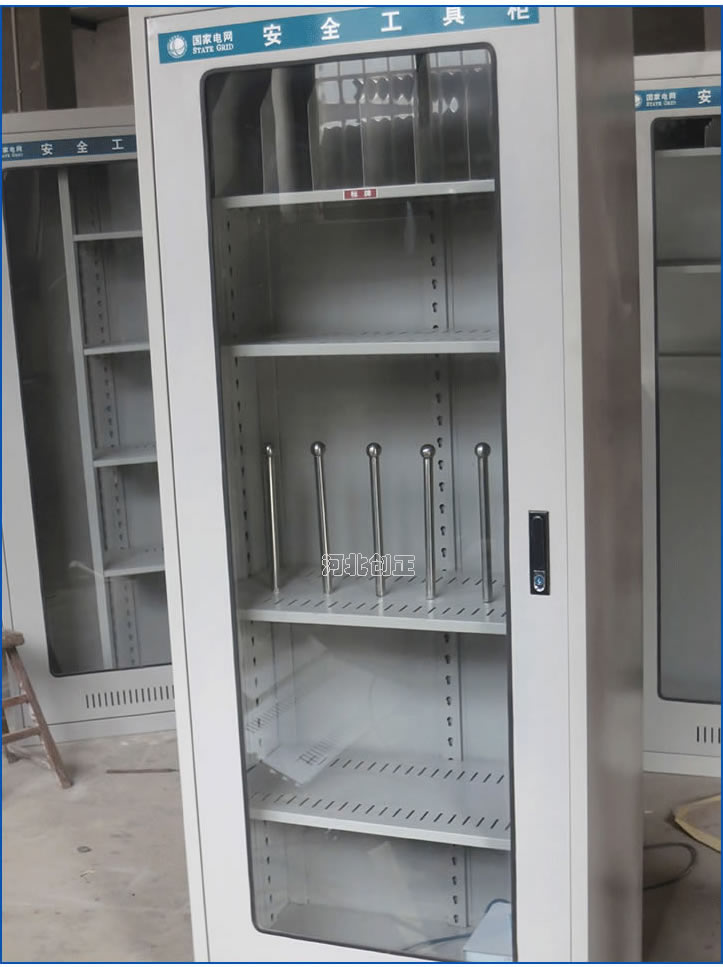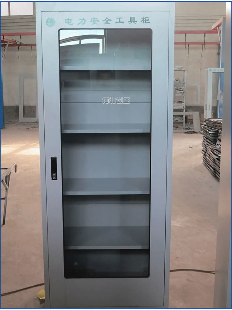 1、柜體是冷軋鋼板卷壓成型,厚度有1.0mm1.2mm,1.5mm供選擇。柜體表面采用靜電防腐噴塑工藝,顏色為駝灰色,柜門裝有通體透明鋼化玻璃,透過玻璃可以看到分類有序的工器具。