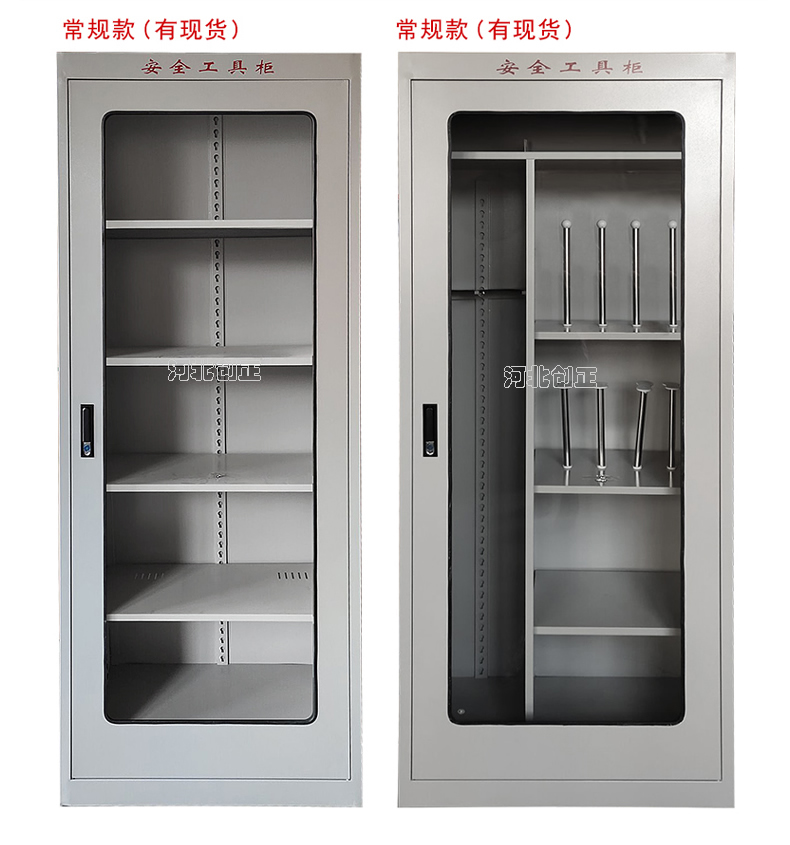 1、柜體是冷軋鋼板卷壓成型,厚度有1.0mm1.2mm1.5mm供選擇。柜體表面采用靜電防腐噴塑工藝,顏色為駝灰色,柜門裝有通體透明鋼化玻璃,透過玻璃可以看到分類有序的工器具。